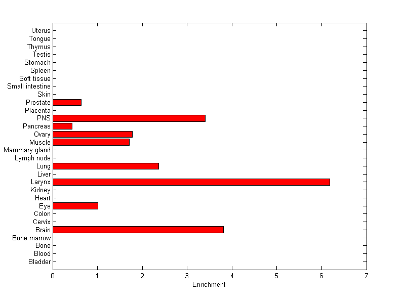 The expression level is normalized with tissue-library size. Each value for a gene in a tissue is a ratio of observed ESTs to the expected one in this tissue. The expected number of ESTs is the product of total ESTs of the gene and the fraction of total ESTs in the tissue among all ESTs in 30 tissues.