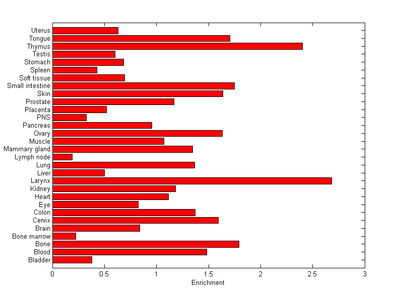 The expression level is normalized with tissue-library size. Each value for a gene in a tissue is a ratio of observed ESTs to the expected one in this tissue. The expected number of ESTs is the product of total ESTs of the gene and the fraction of total ESTs in the tissue among all ESTs in 30 tissues.