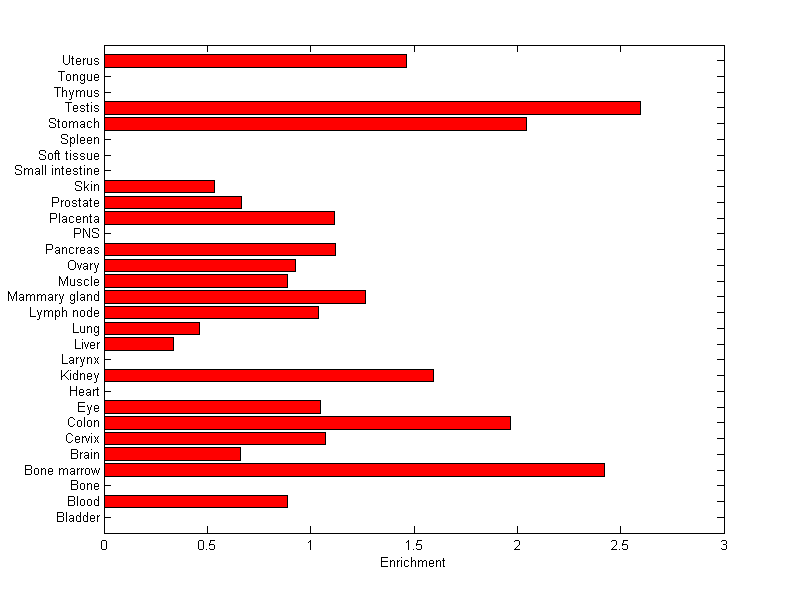 The expression level is normalized with tissue-library size. Each value for a gene in a tissue is a ratio of observed ESTs to the expected one in this tissue. The expected number of ESTs is the product of total ESTs of the gene and the fraction of total ESTs in the tissue among all ESTs in 30 tissues.