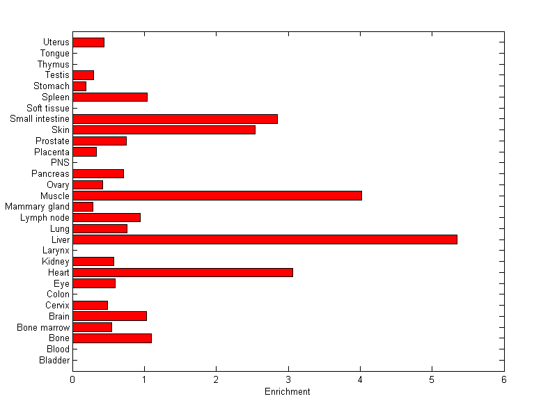 The expression level is normalized with tissue-library size. Each value for a gene in a tissue is a ratio of observed ESTs to the expected one in this tissue. The expected number of ESTs is the product of total ESTs of the gene and the fraction of total ESTs in the tissue among all ESTs in 30 tissues.
