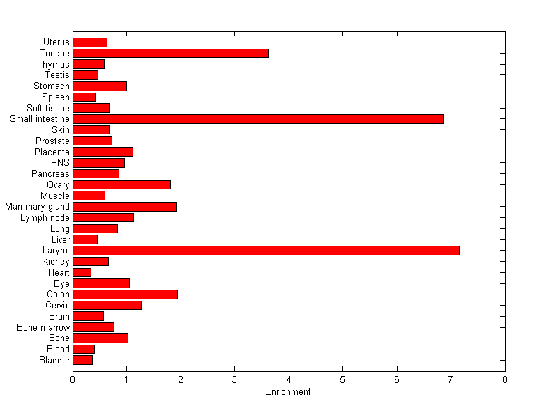 About the profile: The expression level is normalized with tissue-library size. Each value for a gene in a tissue is a ratio of observed ESTs to the expected one in this tissue. The expected number of ESTs is the product of total ESTs of the gene and the fraction of total ESTs in the tissue among all ESTs in 30 tissues. Summary: This gene is preferentially expressed in [larynx, small_intestine] Download: |