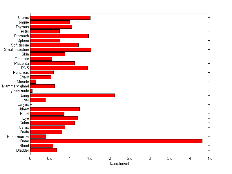 The expression level is normalized with tissue-library size. Each value for a gene in a tissue is a ratio of observed ESTs to the expected one in this tissue. The expected number of ESTs is the product of total ESTs of the gene and the fraction of total ESTs in the tissue among all ESTs in 30 tissues.