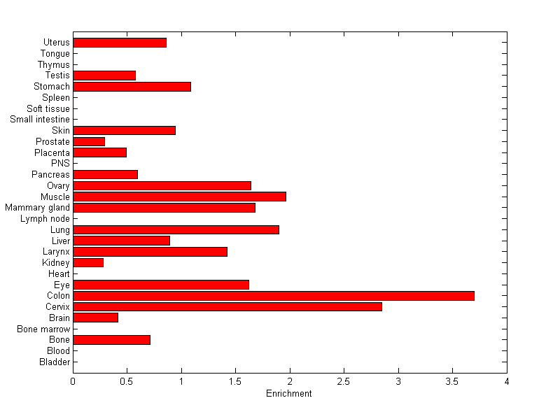 The expression level is normalized with tissue-library size. Each value for a gene in a tissue is a ratio of observed ESTs to the expected one in this tissue. The expected number of ESTs is the product of total ESTs of the gene and the fraction of total ESTs in the tissue among all ESTs in 30 tissues.