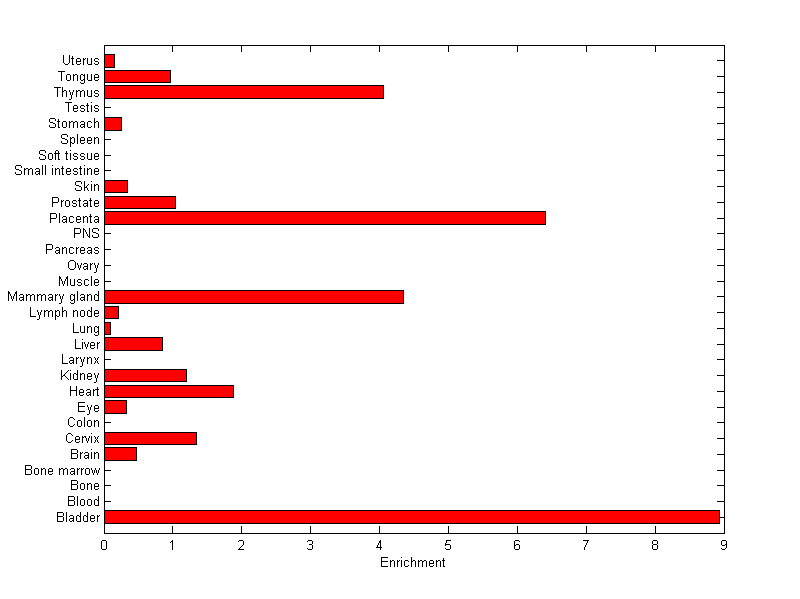 About the profile: The expression level is normalized with tissue-library size. Each value for a gene in a tissue is a ratio of observed ESTs to the expected one in this tissue. The expected number of ESTs is the product of total ESTs of the gene and the fraction of total ESTs in the tissue among all ESTs in 30 tissues. Summary: This gene is preferentially expressed in [bladder, placenta] Download: |