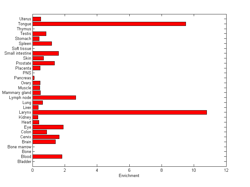 The expression level is normalized with tissue-library size. Each value for a gene in a tissue is a ratio of observed ESTs to the expected one in this tissue. The expected number of ESTs is the product of total ESTs of the gene and the fraction of total ESTs in the tissue among all ESTs in 30 tissues.