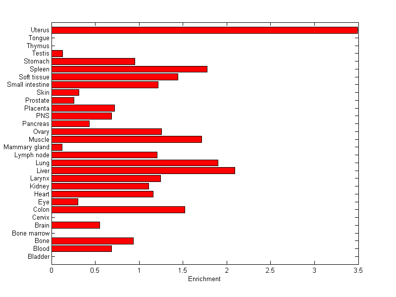 The expression level is normalized with tissue-library size. Each value for a gene in a tissue is a ratio of observed ESTs to the expected one in this tissue. The expected number of ESTs is the product of total ESTs of the gene and the fraction of total ESTs in the tissue among all ESTs in 30 tissues.