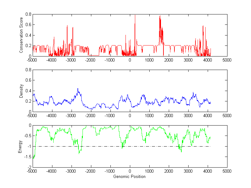 The energy profile (green curve) is about energy for module detection based on TF interaction. The positions with energy less than -1 indicate the existence of CRMs.