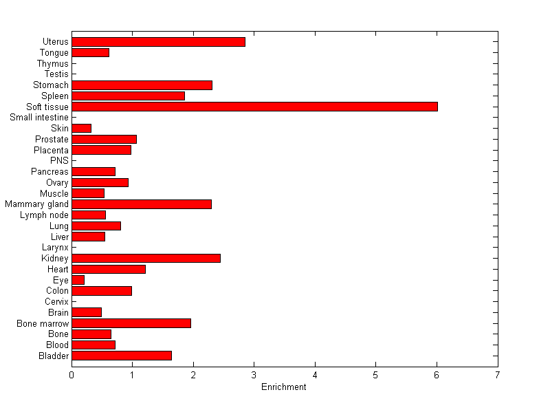 The expression level is normalized with tissue-library size. Each value for a gene in a tissue is a ratio of observed ESTs to the expected one in this tissue. The expected number of ESTs is the product of total ESTs of the gene and the fraction of total ESTs in the tissue among all ESTs in 30 tissues.
