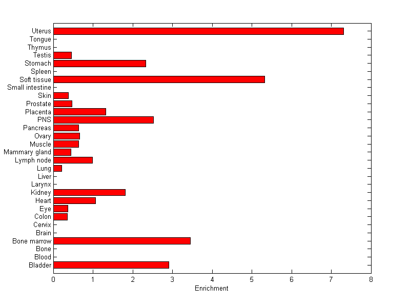 The expression level is normalized with tissue-library size. Each value for a gene in a tissue is a ratio of observed ESTs to the expected one in this tissue. The expected number of ESTs is the product of total ESTs of the gene and the fraction of total ESTs in the tissue among all ESTs in 30 tissues.