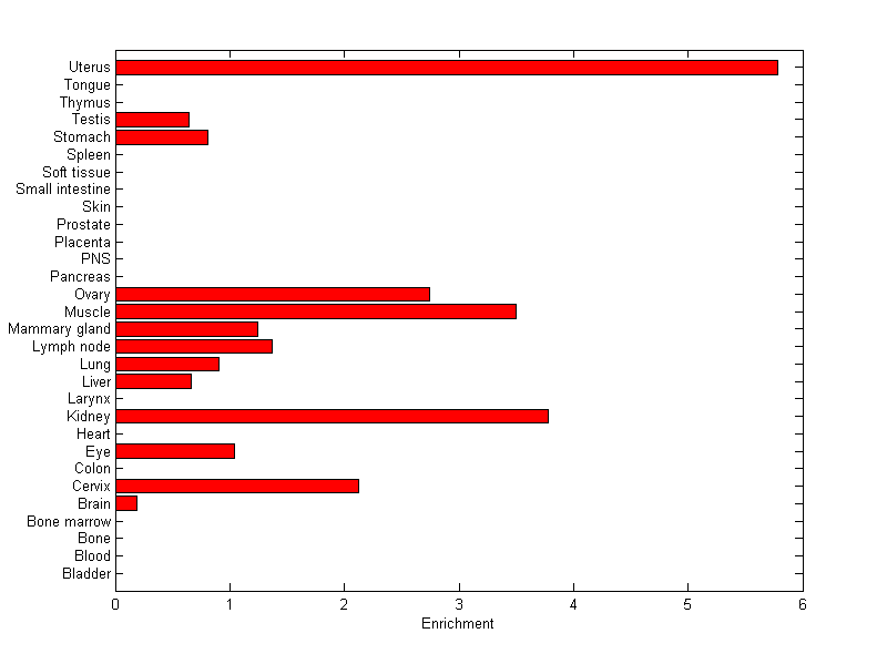 The expression level is normalized with tissue-library size. Each value for a gene in a tissue is a ratio of observed ESTs to the expected one in this tissue. The expected number of ESTs is the product of total ESTs of the gene and the fraction of total ESTs in the tissue among all ESTs in 30 tissues.