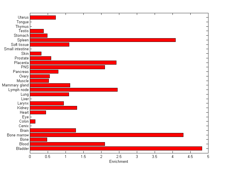 The expression level is normalized with tissue-library size. Each value for a gene in a tissue is a ratio of observed ESTs to the expected one in this tissue. The expected number of ESTs is the product of total ESTs of the gene and the fraction of total ESTs in the tissue among all ESTs in 30 tissues.