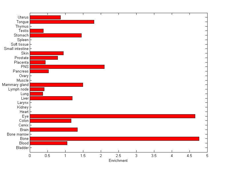 The expression level is normalized with tissue-library size. Each value for a gene in a tissue is a ratio of observed ESTs to the expected one in this tissue. The expected number of ESTs is the product of total ESTs of the gene and the fraction of total ESTs in the tissue among all ESTs in 30 tissues.