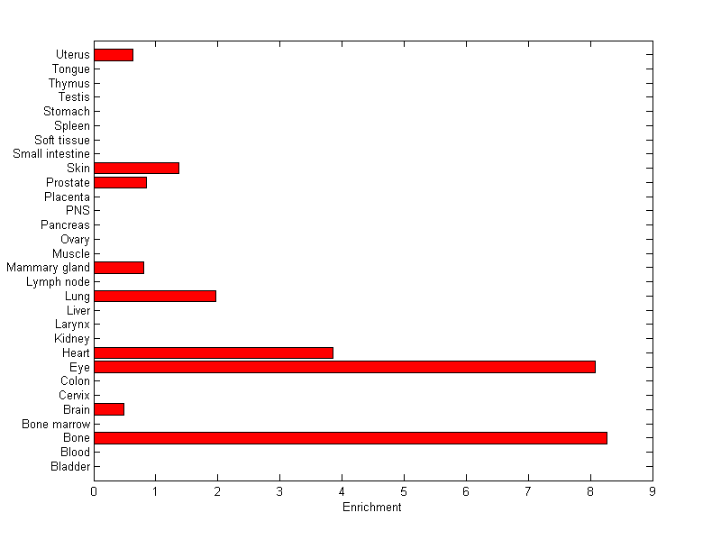 The expression level is normalized with tissue-library size. Each value for a gene in a tissue is a ratio of observed ESTs to the expected one in this tissue. The expected number of ESTs is the product of total ESTs of the gene and the fraction of total ESTs in the tissue among all ESTs in 30 tissues.