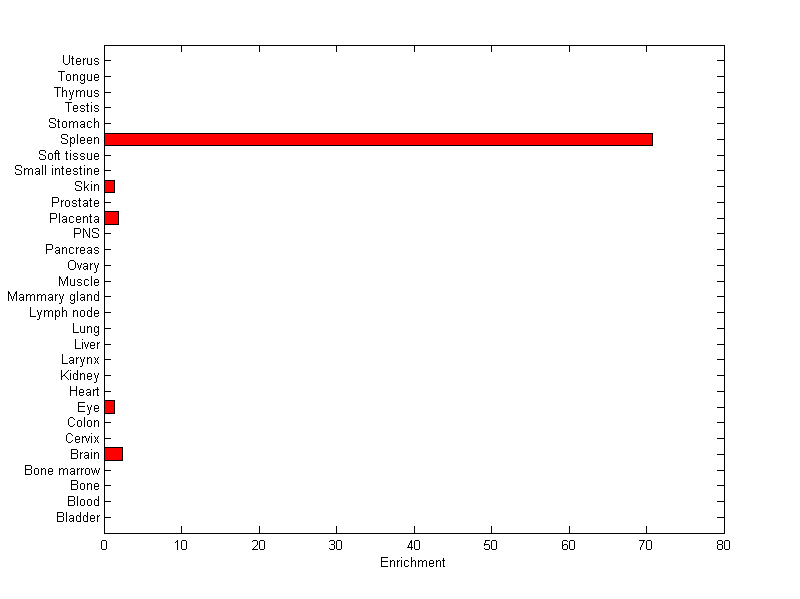 About the profile: The expression level is normalized with tissue-library size. Each value for a gene in a tissue is a ratio of observed ESTs to the expected one in this tissue. The expected number of ESTs is the product of total ESTs of the gene and the fraction of total ESTs in the tissue among all ESTs in 30 tissues. Summary: This gene is preferentially expressed in [spleen] Download: |