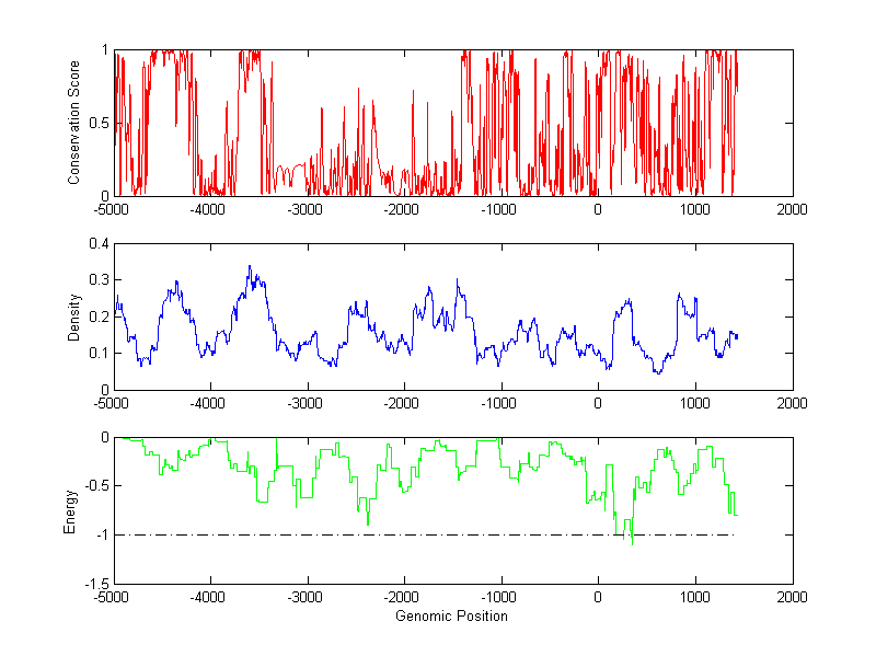 The energy profile (green curve) is about energy for module detection based on TF interaction. The positions with energy less than -1 indicate the existence of CRMs.