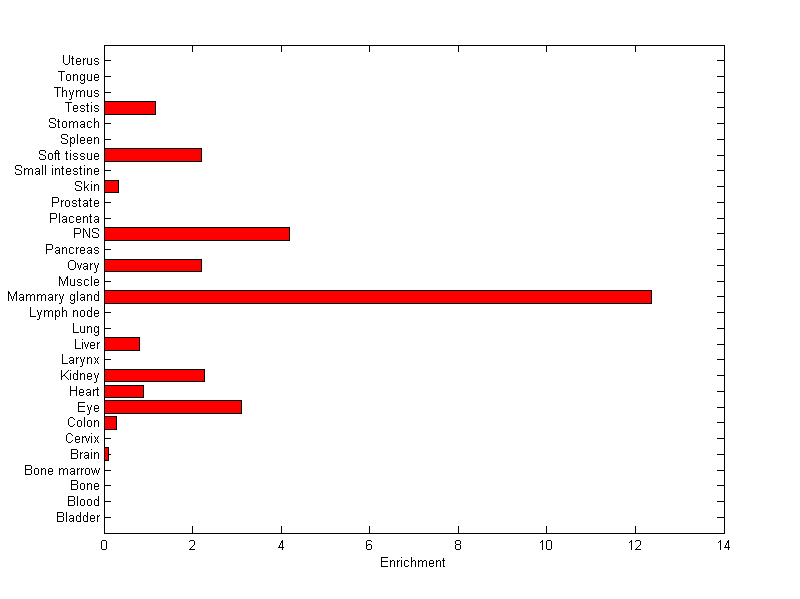 The expression level is normalized with tissue-library size. Each value for a gene in a tissue is a ratio of observed ESTs to the expected one in this tissue. The expected number of ESTs is the product of total ESTs of the gene and the fraction of total ESTs in the tissue among all ESTs in 30 tissues.