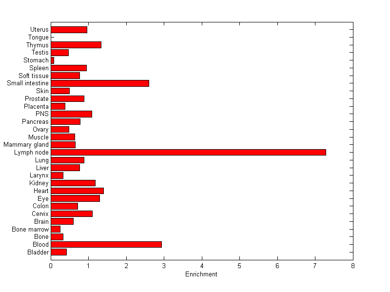 The expression level is normalized with tissue-library size. Each value for a gene in a tissue is a ratio of observed ESTs to the expected one in this tissue. The expected number of ESTs is the product of total ESTs of the gene and the fraction of total ESTs in the tissue among all ESTs in 30 tissues.