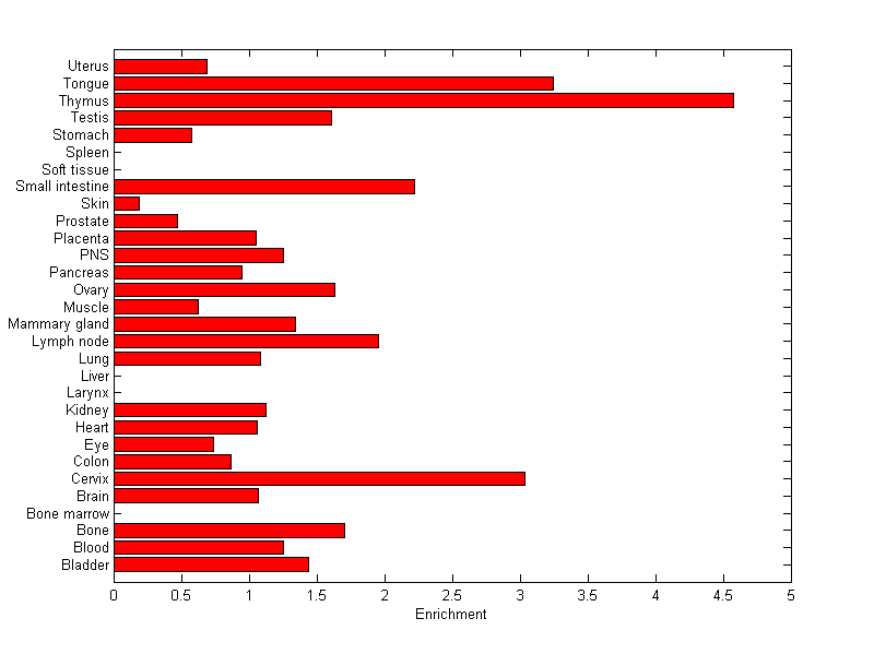 The expression level is normalized with tissue-library size. Each value for a gene in a tissue is a ratio of observed ESTs to the expected one in this tissue. The expected number of ESTs is the product of total ESTs of the gene and the fraction of total ESTs in the tissue among all ESTs in 30 tissues.