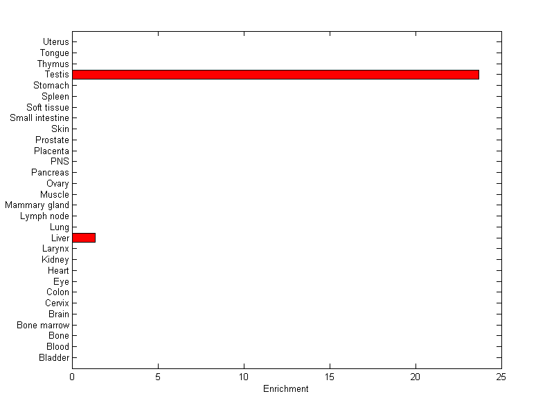 The expression level is normalized with tissue-library size. Each value for a gene in a tissue is a ratio of observed ESTs to the expected one in this tissue. The expected number of ESTs is the product of total ESTs of the gene and the fraction of total ESTs in the tissue among all ESTs in 30 tissues.