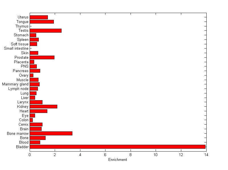 The expression level is normalized with tissue-library size. Each value for a gene in a tissue is a ratio of observed ESTs to the expected one in this tissue. The expected number of ESTs is the product of total ESTs of the gene and the fraction of total ESTs in the tissue among all ESTs in 30 tissues.