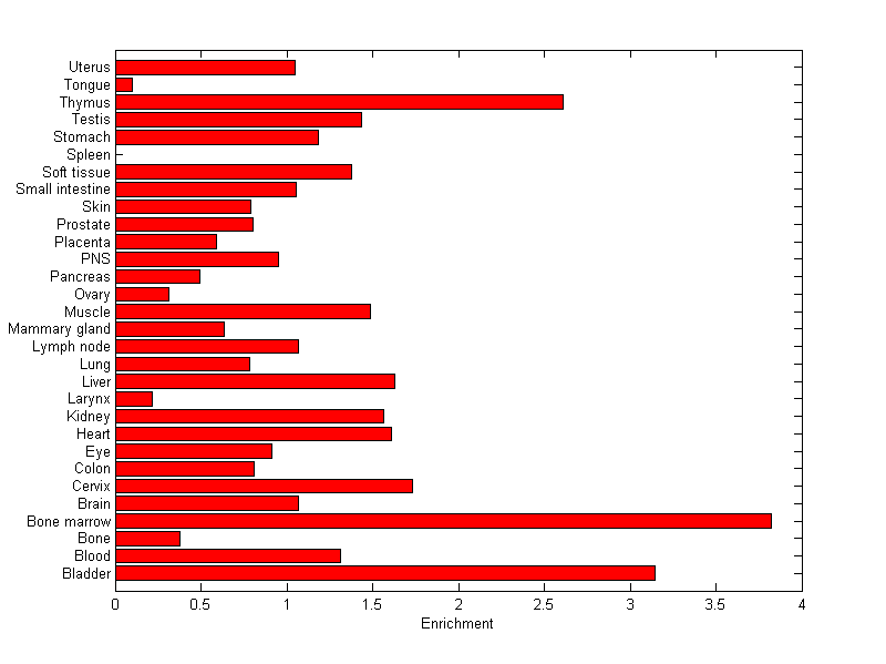 The expression level is normalized with tissue-library size. Each value for a gene in a tissue is a ratio of observed ESTs to the expected one in this tissue. The expected number of ESTs is the product of total ESTs of the gene and the fraction of total ESTs in the tissue among all ESTs in 30 tissues.
