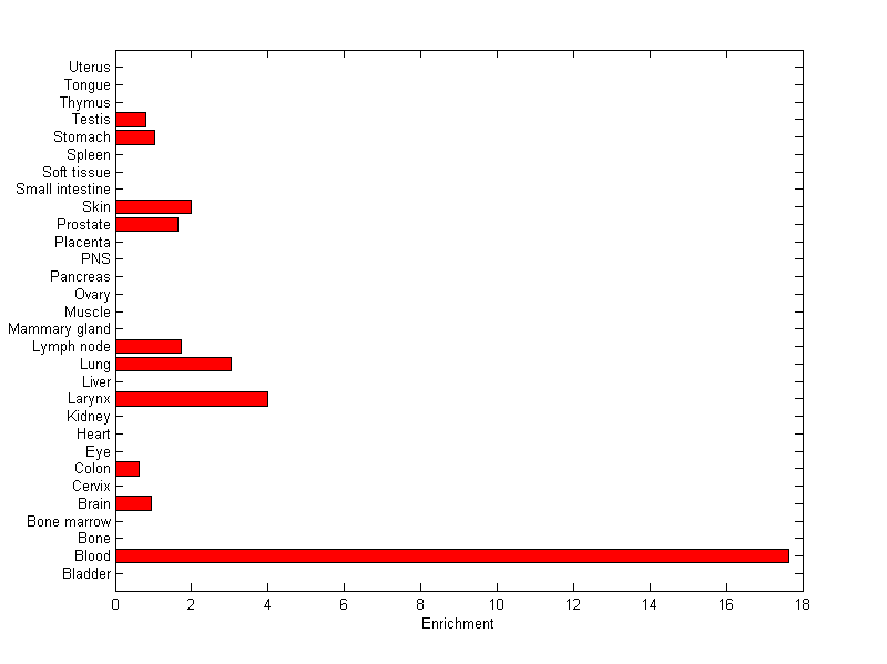 The expression level is normalized with tissue-library size. Each value for a gene in a tissue is a ratio of observed ESTs to the expected one in this tissue. The expected number of ESTs is the product of total ESTs of the gene and the fraction of total ESTs in the tissue among all ESTs in 30 tissues.