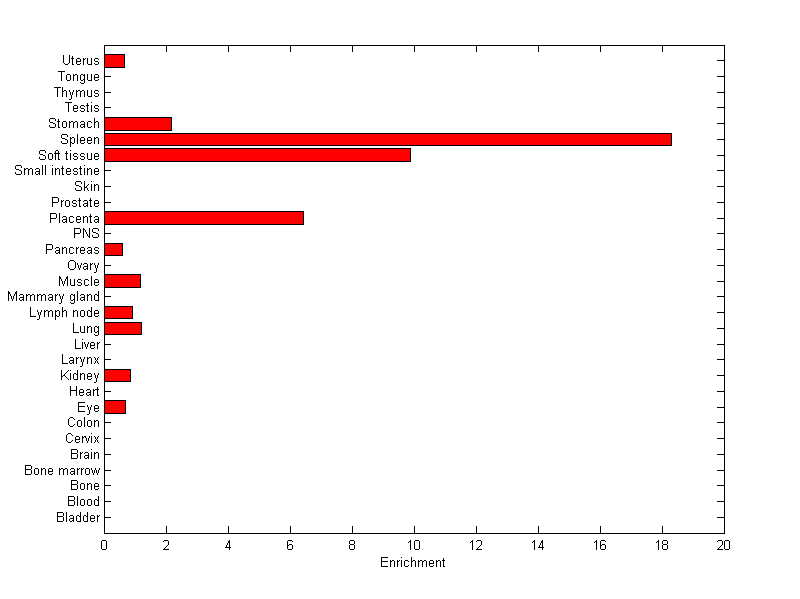 The expression level is normalized with tissue-library size. Each value for a gene in a tissue is a ratio of observed ESTs to the expected one in this tissue. The expected number of ESTs is the product of total ESTs of the gene and the fraction of total ESTs in the tissue among all ESTs in 30 tissues.
