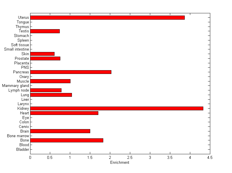 The expression level is normalized with tissue-library size. Each value for a gene in a tissue is a ratio of observed ESTs to the expected one in this tissue. The expected number of ESTs is the product of total ESTs of the gene and the fraction of total ESTs in the tissue among all ESTs in 30 tissues.