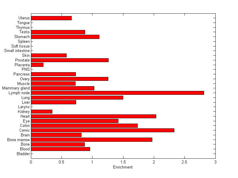 The expression level is normalized with tissue-library size. Each value for a gene in a tissue is a ratio of observed ESTs to the expected one in this tissue. The expected number of ESTs is the product of total ESTs of the gene and the fraction of total ESTs in the tissue among all ESTs in 30 tissues.