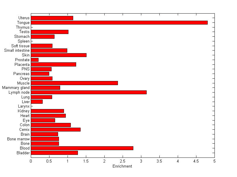 The expression level is normalized with tissue-library size. Each value for a gene in a tissue is a ratio of observed ESTs to the expected one in this tissue. The expected number of ESTs is the product of total ESTs of the gene and the fraction of total ESTs in the tissue among all ESTs in 30 tissues.