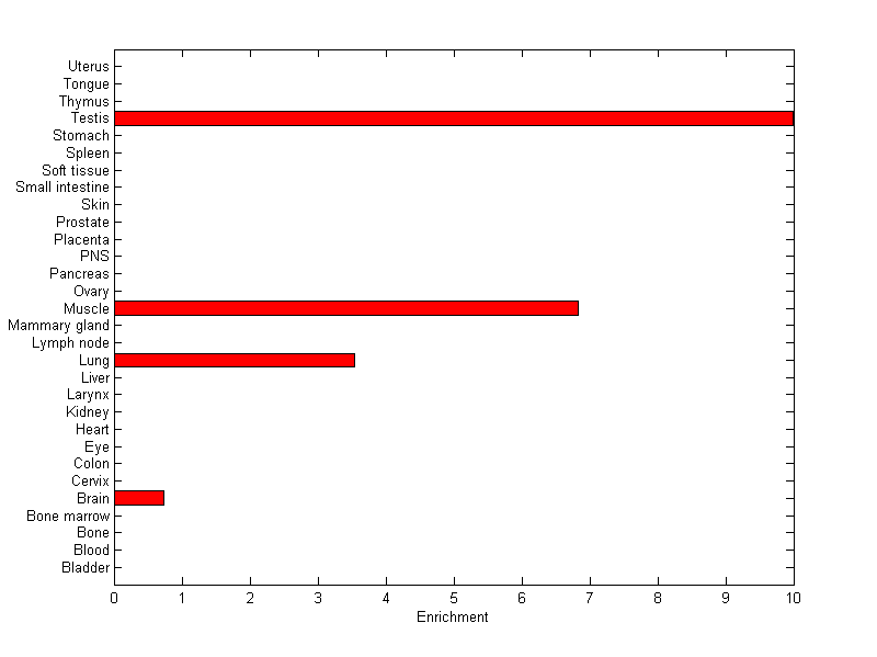The expression level is normalized with tissue-library size. Each value for a gene in a tissue is a ratio of observed ESTs to the expected one in this tissue. The expected number of ESTs is the product of total ESTs of the gene and the fraction of total ESTs in the tissue among all ESTs in 30 tissues.