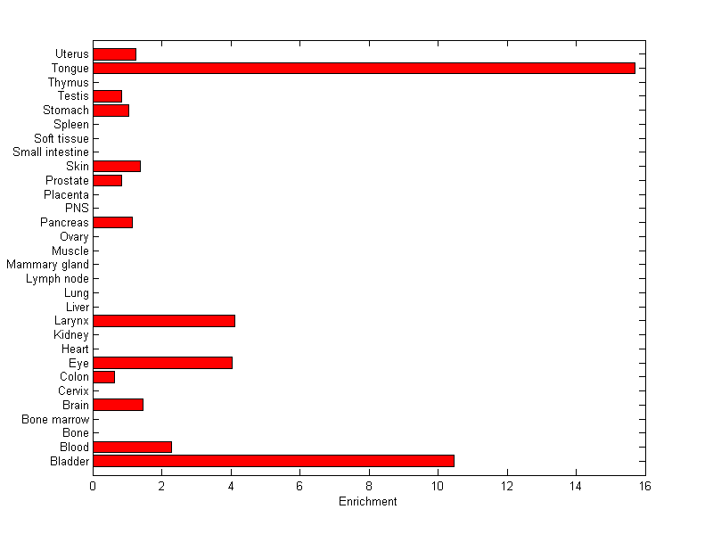 The expression level is normalized with tissue-library size. Each value for a gene in a tissue is a ratio of observed ESTs to the expected one in this tissue. The expected number of ESTs is the product of total ESTs of the gene and the fraction of total ESTs in the tissue among all ESTs in 30 tissues.