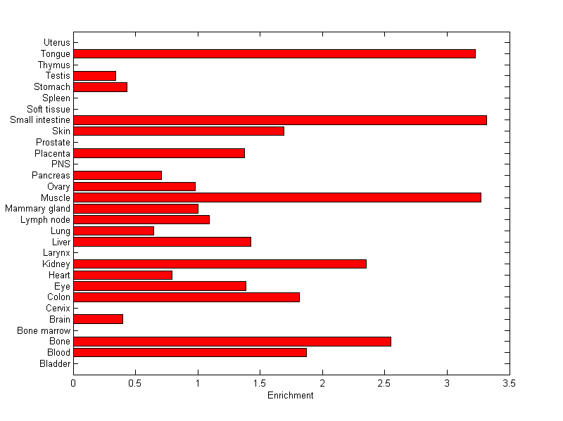 The expression level is normalized with tissue-library size. Each value for a gene in a tissue is a ratio of observed ESTs to the expected one in this tissue. The expected number of ESTs is the product of total ESTs of the gene and the fraction of total ESTs in the tissue among all ESTs in 30 tissues.