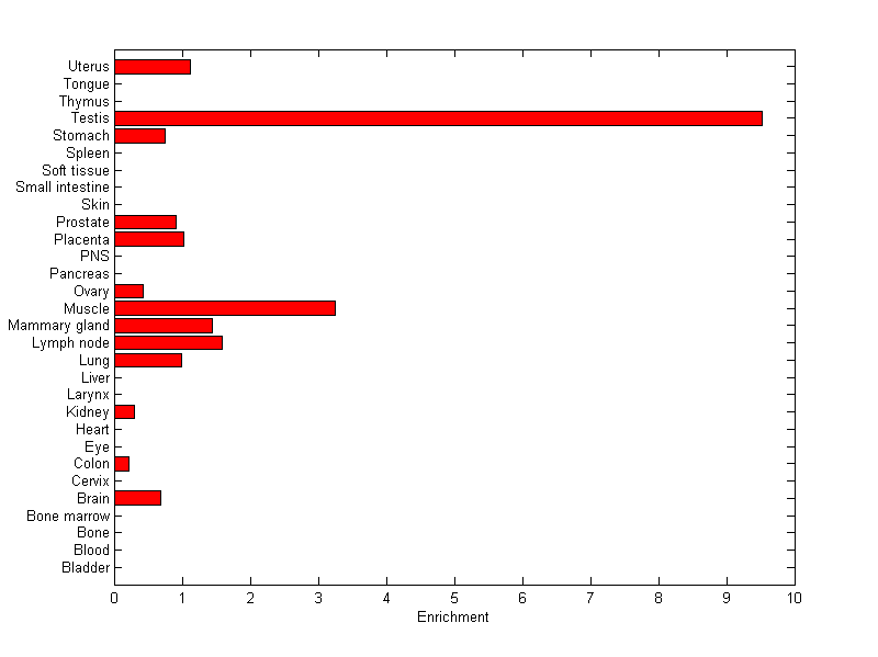 The expression level is normalized with tissue-library size. Each value for a gene in a tissue is a ratio of observed ESTs to the expected one in this tissue. The expected number of ESTs is the product of total ESTs of the gene and the fraction of total ESTs in the tissue among all ESTs in 30 tissues.