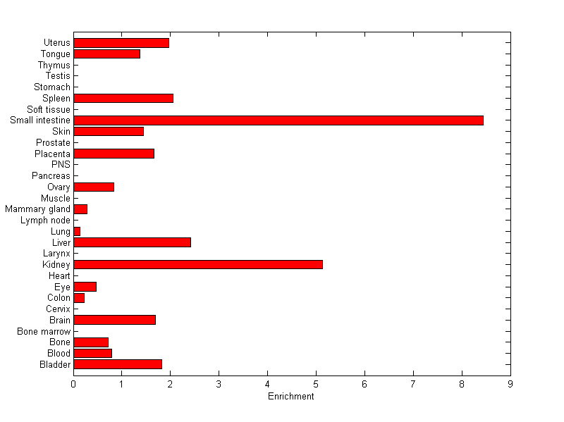 The expression level is normalized with tissue-library size. Each value for a gene in a tissue is a ratio of observed ESTs to the expected one in this tissue. The expected number of ESTs is the product of total ESTs of the gene and the fraction of total ESTs in the tissue among all ESTs in 30 tissues.