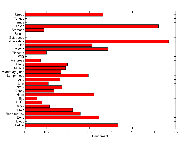 The expression level is normalized with tissue-library size. Each value for a gene in a tissue is a ratio of observed ESTs to the expected one in this tissue. The expected number of ESTs is the product of total ESTs of the gene and the fraction of total ESTs in the tissue among all ESTs in 30 tissues.