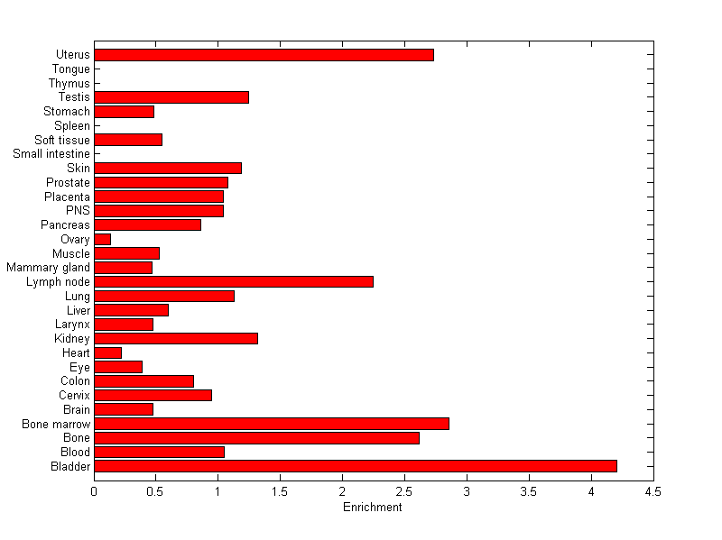 The expression level is normalized with tissue-library size. Each value for a gene in a tissue is a ratio of observed ESTs to the expected one in this tissue. The expected number of ESTs is the product of total ESTs of the gene and the fraction of total ESTs in the tissue among all ESTs in 30 tissues.