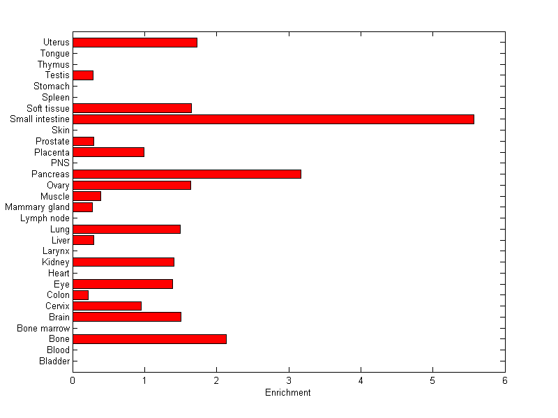 The expression level is normalized with tissue-library size. Each value for a gene in a tissue is a ratio of observed ESTs to the expected one in this tissue. The expected number of ESTs is the product of total ESTs of the gene and the fraction of total ESTs in the tissue among all ESTs in 30 tissues.