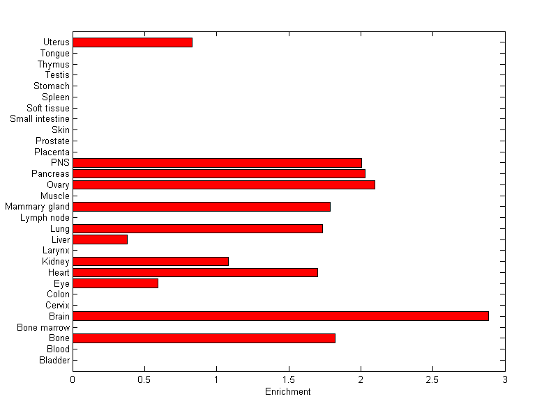 The expression level is normalized with tissue-library size. Each value for a gene in a tissue is a ratio of observed ESTs to the expected one in this tissue. The expected number of ESTs is the product of total ESTs of the gene and the fraction of total ESTs in the tissue among all ESTs in 30 tissues.
