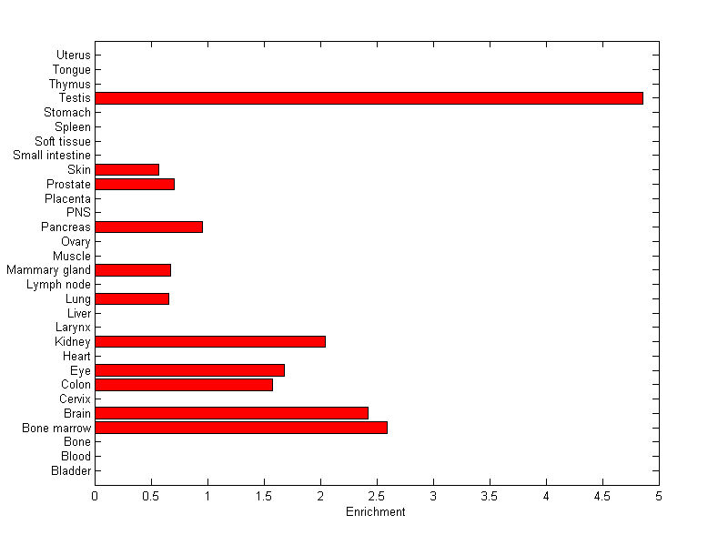 The expression level is normalized with tissue-library size. Each value for a gene in a tissue is a ratio of observed ESTs to the expected one in this tissue. The expected number of ESTs is the product of total ESTs of the gene and the fraction of total ESTs in the tissue among all ESTs in 30 tissues.