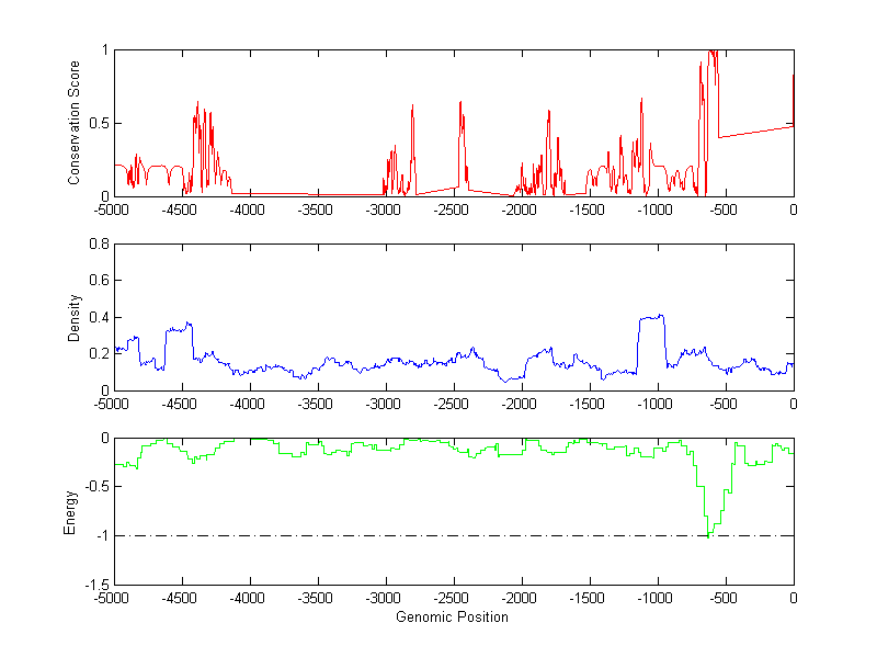 The energy profile (green curve) is about energy for module detection based on TF interaction. The positions with energy less than -1 indicate the existence of CRMs.