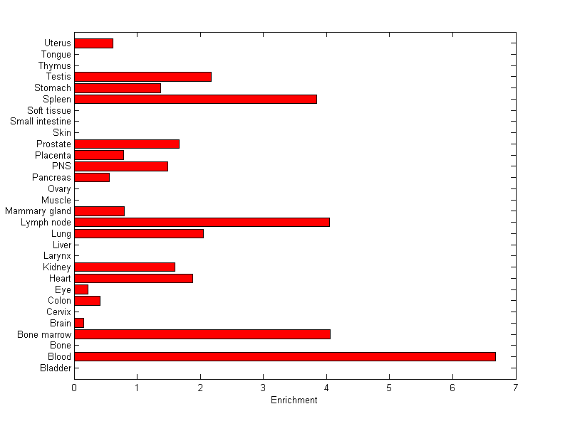 The expression level is normalized with tissue-library size. Each value for a gene in a tissue is a ratio of observed ESTs to the expected one in this tissue. The expected number of ESTs is the product of total ESTs of the gene and the fraction of total ESTs in the tissue among all ESTs in 30 tissues.