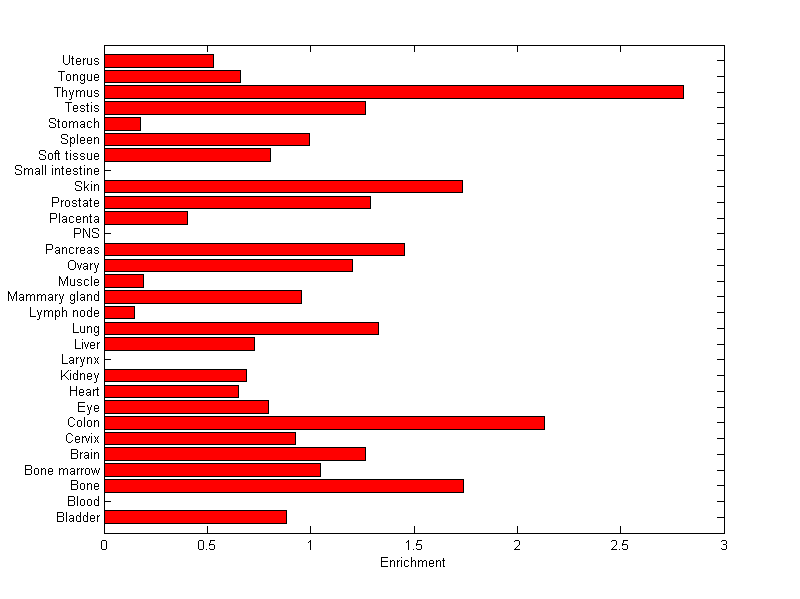 The expression level is normalized with tissue-library size. Each value for a gene in a tissue is a ratio of observed ESTs to the expected one in this tissue. The expected number of ESTs is the product of total ESTs of the gene and the fraction of total ESTs in the tissue among all ESTs in 30 tissues.