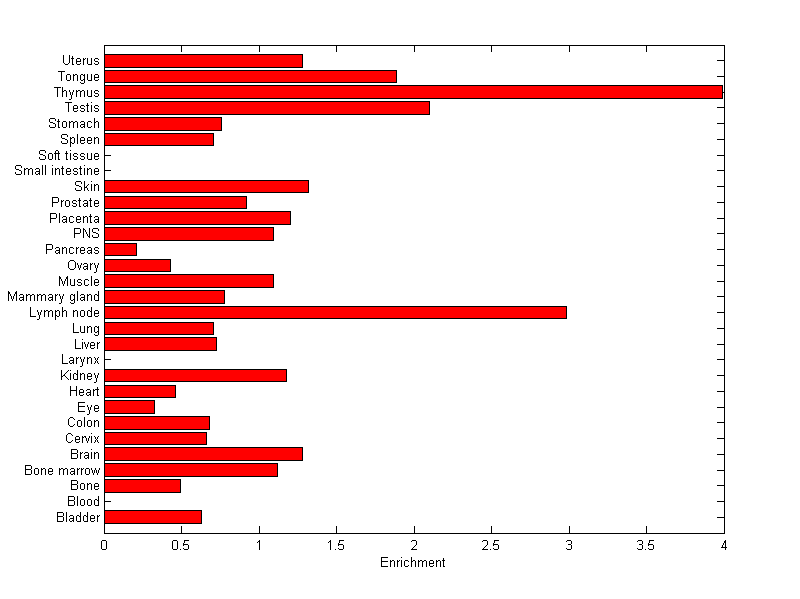 The expression level is normalized with tissue-library size. Each value for a gene in a tissue is a ratio of observed ESTs to the expected one in this tissue. The expected number of ESTs is the product of total ESTs of the gene and the fraction of total ESTs in the tissue among all ESTs in 30 tissues.