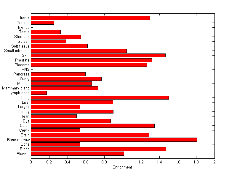 The expression level is normalized with tissue-library size. Each value for a gene in a tissue is a ratio of observed ESTs to the expected one in this tissue. The expected number of ESTs is the product of total ESTs of the gene and the fraction of total ESTs in the tissue among all ESTs in 30 tissues.