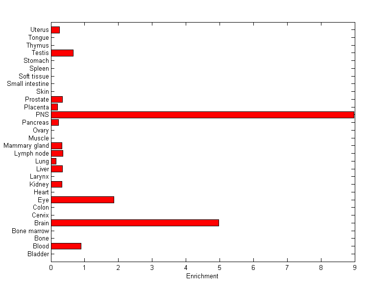 The expression level is normalized with tissue-library size. Each value for a gene in a tissue is a ratio of observed ESTs to the expected one in this tissue. The expected number of ESTs is the product of total ESTs of the gene and the fraction of total ESTs in the tissue among all ESTs in 30 tissues.