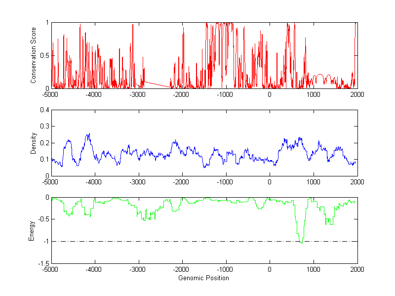 The energy profile (green curve) is about energy for module detection based on TF interaction. The positions with energy less than -1 indicate the existence of CRMs.