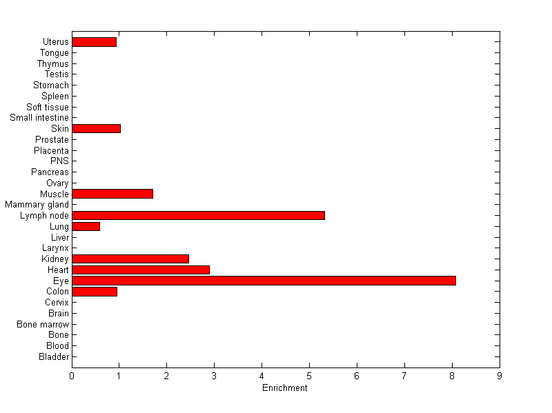 The expression level is normalized with tissue-library size. Each value for a gene in a tissue is a ratio of observed ESTs to the expected one in this tissue. The expected number of ESTs is the product of total ESTs of the gene and the fraction of total ESTs in the tissue among all ESTs in 30 tissues.