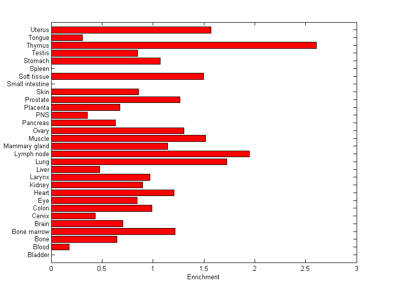 The expression level is normalized with tissue-library size. Each value for a gene in a tissue is a ratio of observed ESTs to the expected one in this tissue. The expected number of ESTs is the product of total ESTs of the gene and the fraction of total ESTs in the tissue among all ESTs in 30 tissues.