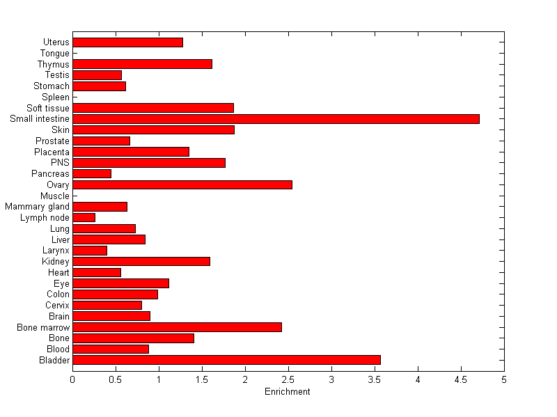 The expression level is normalized with tissue-library size. Each value for a gene in a tissue is a ratio of observed ESTs to the expected one in this tissue. The expected number of ESTs is the product of total ESTs of the gene and the fraction of total ESTs in the tissue among all ESTs in 30 tissues.